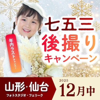 七五三シーズン撮影できなかったご家族様にむけてゆったりと撮影できる「あと撮り」キャンペーンのお知らせです✨ご家族そろってお着物での撮影も行えますよ😊「今しか残せない一瞬」を、この時期限定のお得な価格でお届けします🎁 忘れられない思い出をカタチにしませんか💖 💖 期間中の特典・パパママきもの無料・パパママ着付け無料・ご祖父母さまと一緒に来店でカラースタンドプレゼント・平日のご来店で七五三写真のアクリルスタンドプレゼント・アルバムMAX2万円オフ!・15万円以上のご購入でお会計から20%オフ 🔴対象アルバム(C・Dアルバム)が15%OFF🔴対象アルバム(Eアルバム)が2万円OFF! 利用したい店舗のLINEにてご希望の来店お時間をお伝えください。ご相談やお問い合わせも承っております。⭐️キャンペーン期間:2025年12月末まで ________________________________________________ ▼▼ 車でお越しの方へ駐車場のご案内 ▼▼ 🩷フォトスタジオ・フェリーク 仙台店〒980-0811 宮城県仙台市青葉区一番町3-3-1 Kurax3FOPEN:10:00-19:00 (不定休/Kuraxビルの休みに準ずる)🚗 Kuraxビル提携駐車場あり ※下記案内図を参照ください(3,000円以上のお会計でサービス券発行) 💚フォトスタジオ・フェリーク 山形店〒990-2453 山形県山形市若宮1030-1OPEN:10:00-18:30 水曜定休日🚗 駐車場あり(約20台)
