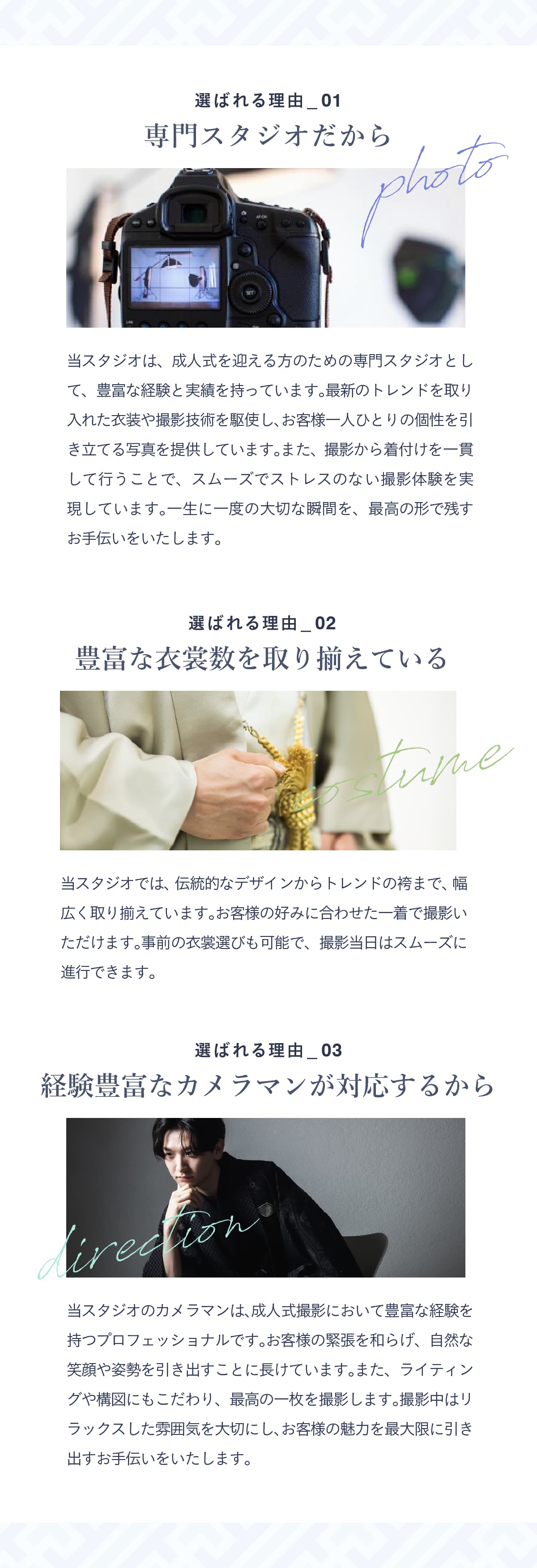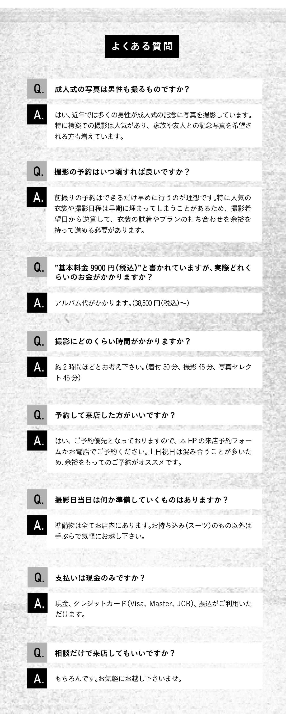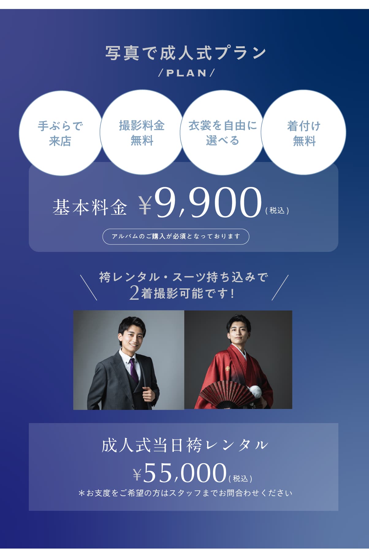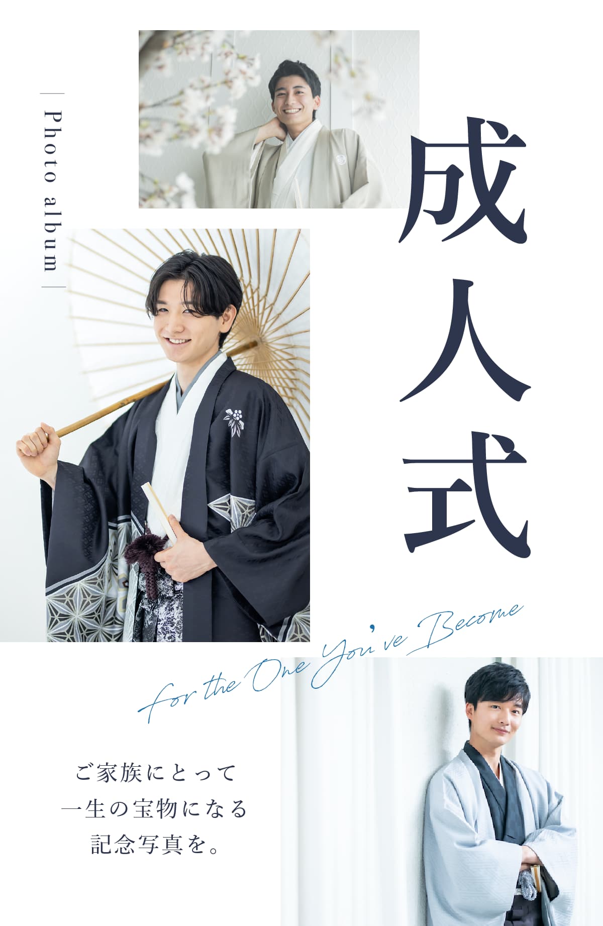 フェリークでは、プロのカメラマンが20歳の記念を渾身のベストショットでかっこよく残します。 ご本人だけでなく、ご家族や彼女と一緒の撮影も人気です。
