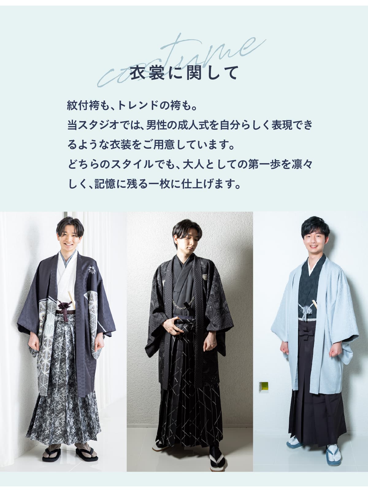フェリークでは男性袴もご用意していますので、安心して撮影にお越しくださいませ。(スーツはご持参くださいませ)